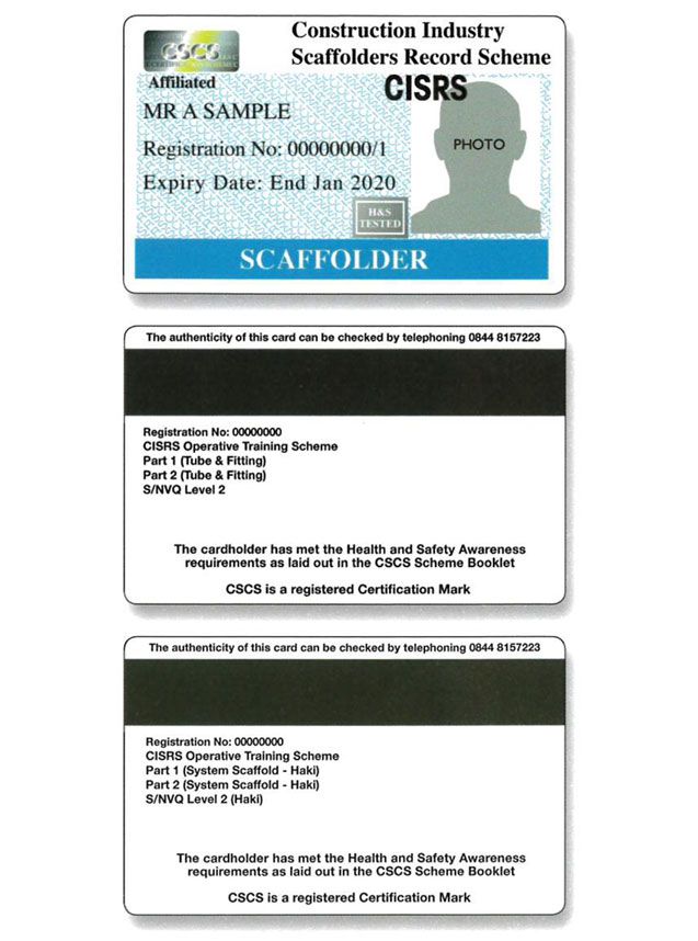 Upon successful completion of CISRS Part 1, CISRS Part 2, NVQ2/SCQF5, CISRS 1 Day Skills Test & CITB HS&E Operatives Test (or accepted exemption) an operative can apply for the CISRS Scaffolder Card.